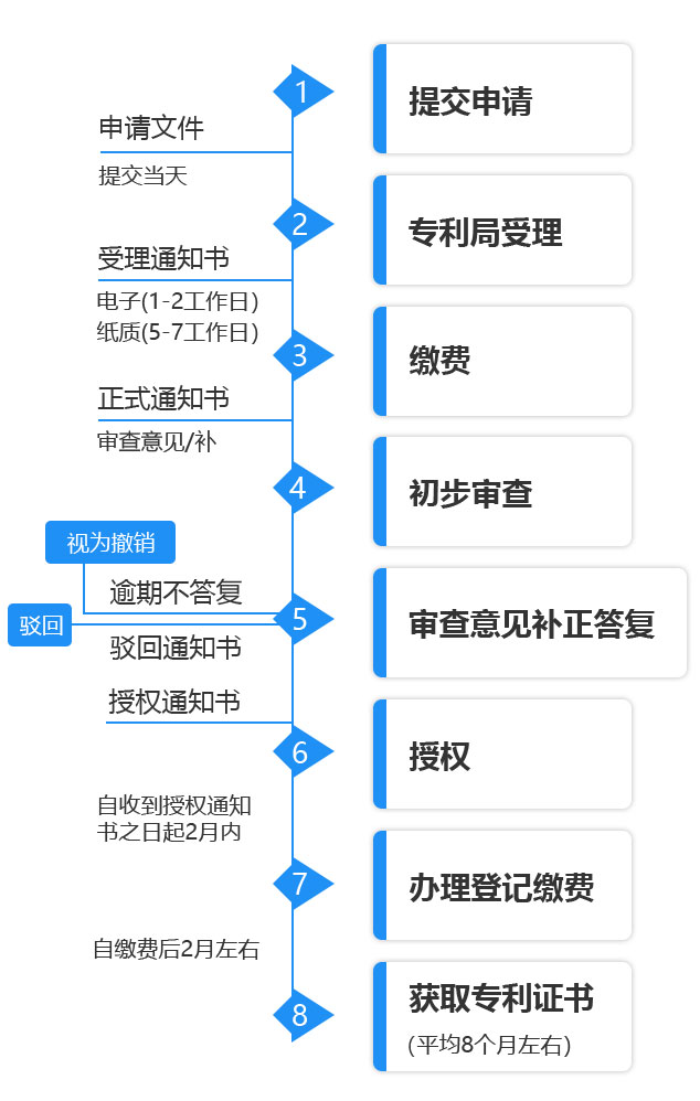 1、在线下单 2、专属顾问咨询 3、支付费用、准备并核查材料 4、向专利局递交申请