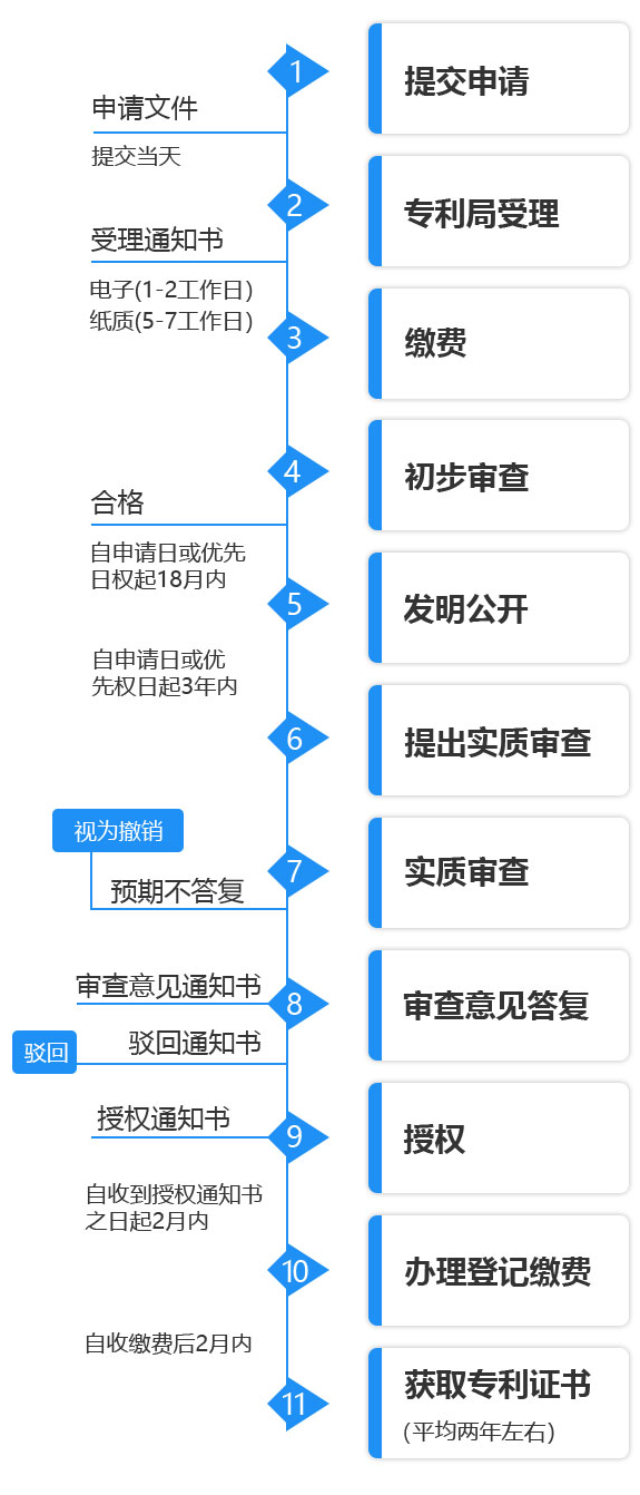 1、在线下单 2、专属顾问咨询(案件评估分析确定最佳保护方案) 3、支付费用、申请文件撰写(5-12个工作日完成) 4、递交国知局(1个工作日) 5、国知局审查(一般12-20个月) 6、获得授权证书(1-2个月)